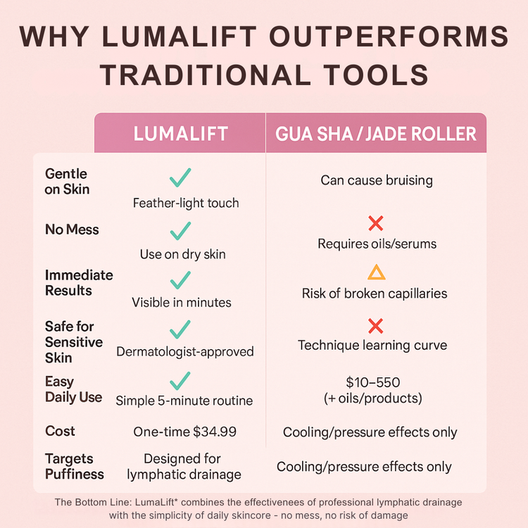 Why settle for bruises and messy oils? LumaLift™ delivers instant results with zero irritation. Its feather-light, dermatologist-approved design outperforms traditional tools by combining professional-level lymphatic drainage with effortless daily comfort.